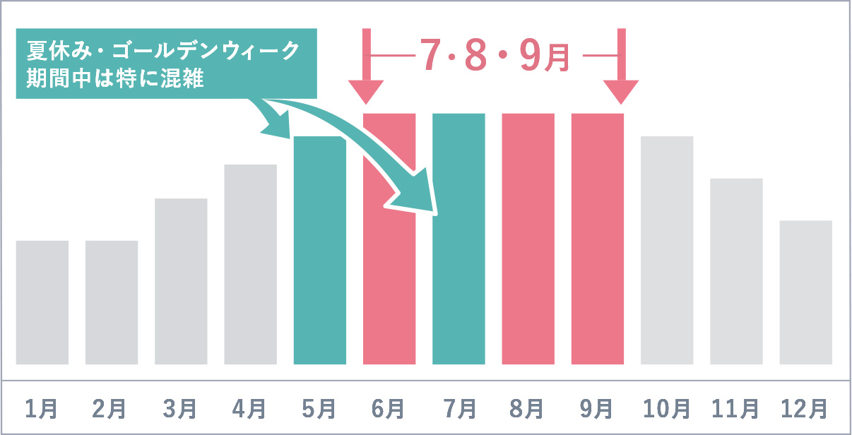 - ハイシーズン(7⽉・8月・9⽉)、ゴールデンウィーク・夏休み期間中の混雑期は、駐車場が満車となり、駐車いただけない事が想定されます。
