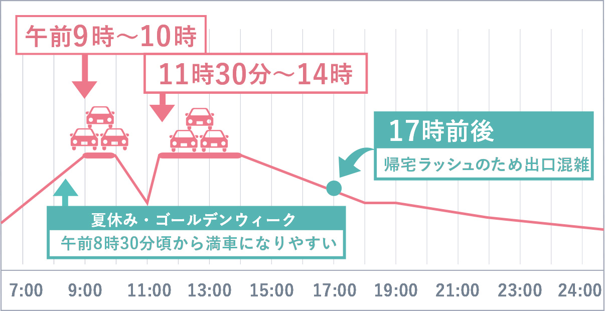 また、平日・土日・混雑期の午後5時前後は、駐車場出口が混雑します。