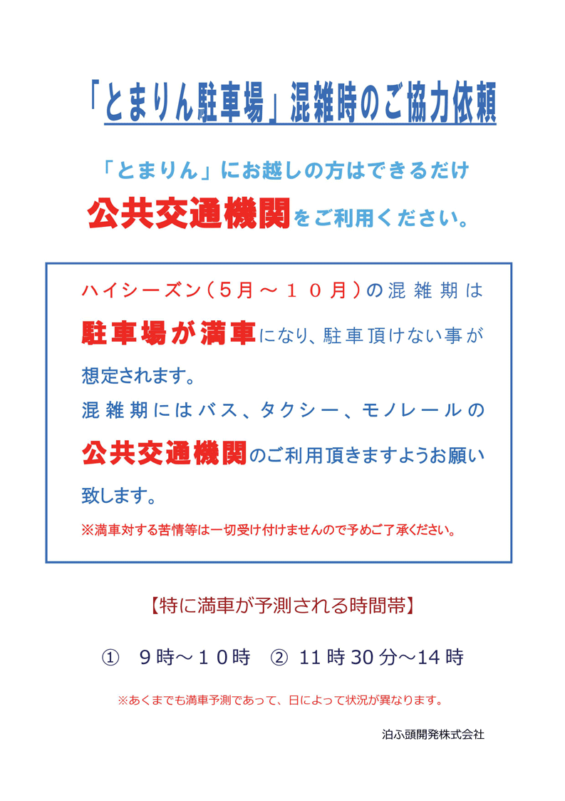 | 内容 | ハイシーズン( 5 月~ 1 0 月) の混雑期は駐車場が満車になり、駐車頂けない事が想定されます。 混雑期にはバス、タクシー、モノレールの公共交通機関のご利用頂きますようお願い致します。 ※満車に対する苦情等は一切受け付けませんので予めご了承ください。 【特に満車が予測される時間帯】 ① 9時~10時 ➁ 11時30分~14時 ※あくまでも満車予測であって、日によって状況が異なります。 |