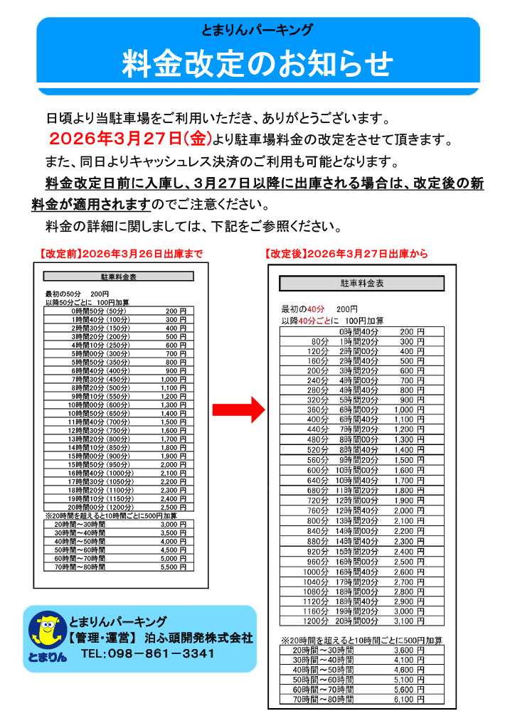 とまりんパーキング料金改定のお知らせ 2026.02.26 お知らせ 日頃より当駐車場をご利用いただき、ありがとうございます。 2026年3月27日(金)より駐車場料金の改定をさせて頂きます。また、同日よりキャッシュレス決済のご利用も可能となります。 料金改定日前に入庫し、3月27日以降に出庫される場合は、改定後の新料金が適用されますのでご注意ください。 料金の詳細に関しましては、下記をご参照ください。 とまりんパーキング料金改定のお知らせ ふれんどしっぷとまりん第23号を発刊しました。 Webサイトをリニューアルいたしました。