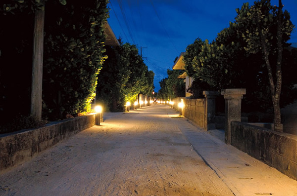 原風景が残る集落、役場からあがり浜まで続く村道1号線では、夜になるとフットライトが白砂の道を照らし、幻想的な雰囲気を醸し出します。