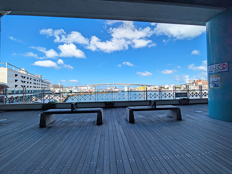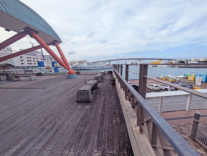 2Fのデッキからは、フェリーの出航・帰港をゆったり眺めることができます。