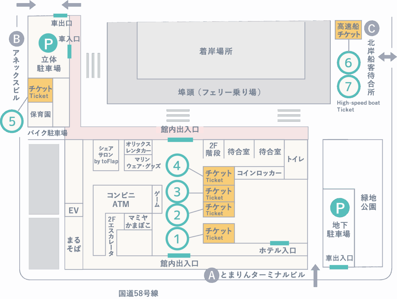 | ①泊港窓口 | 那覇市前島 3-25-1(ターミナルビル 1F) |